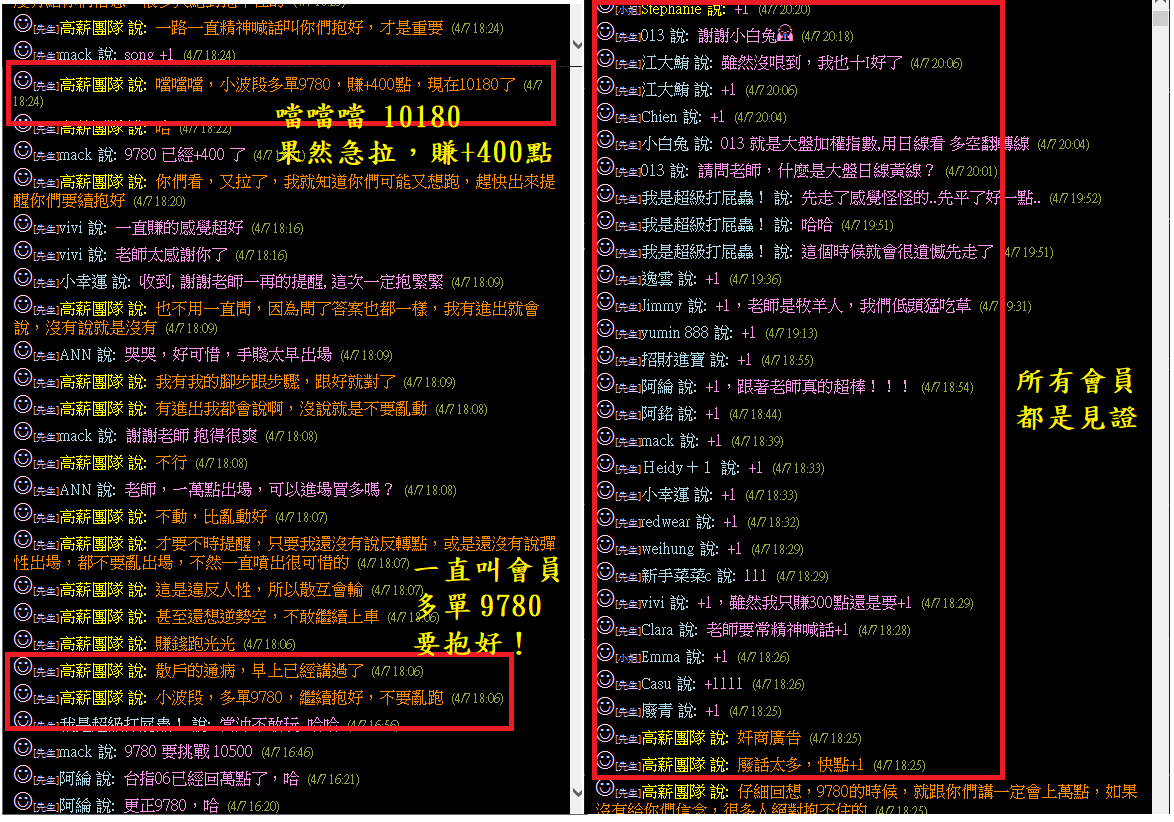 來,看看,昨天【至少講10遍】叫大家把多單10685抱好,還一直叫新會員,這筆多單一定要上車跟好,還說隨便也賺超過+100點